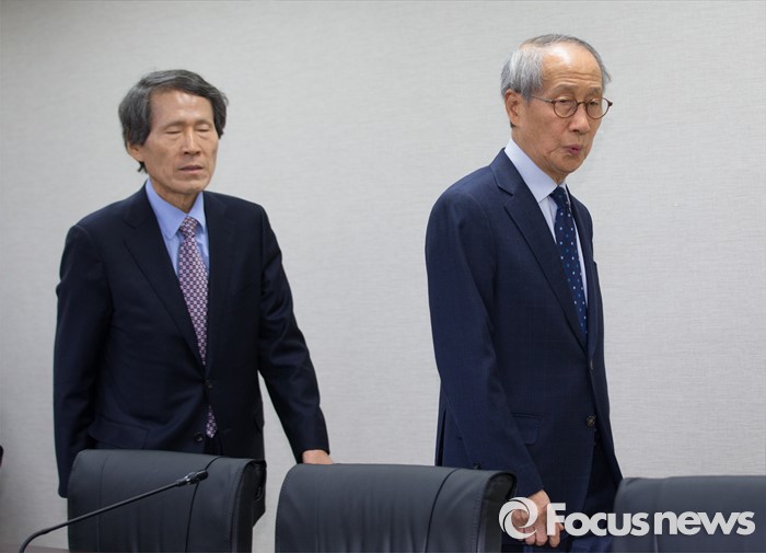 (서울=포커스뉴스) 국민의당(가칭) 창당준비위원회 위원장직을 수락한 후 2주 만에 모습을 드러낸 윤여준 전 장관이 한상진 공동 창준위원장과 함께 20일 오전 서울 마포구 국민의당(가칭) 당사에서 열린 기획조정회의에 참석하고 있다.