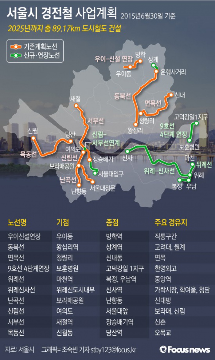 (서울=포커스뉴스) 국토교통부가 서울 위례∼신사선과 신림선을 포함한 서울시의 경전철 사업계획을 확정했다. 2025년까지 총 89.17km 도시철도를 건설할 예정이다.