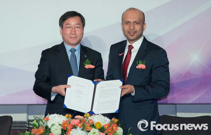 (인천=포커스뉴스) 22일 오후 인천 연수구 쉐라톤인천호텔에서 열린 검단 스마트시티 MOA 체결식에서 유정복(왼쪽) 인천시장과 자버 빈 하페즈 두바이 스마트시티 CEO가 협약서 서명 후 기념촬영을 하고 있다.