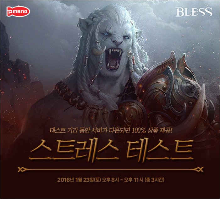 테스트 시간 동안 10레벨을 달성한 이용자에게는, 단계별로 공개서비스에서 사용할 수 있는 프리미엄 서비스 상품을 보상으로 지급한다. 아울러 대기열로 인해 게임에 접속하지 못한 이용자 중 100명에게도 추첨을 통해 프리미엄 서비스 상품을 증정한다. 보다 자세한 사항은 공식 홈페이지(bless.pmang.com)에서 확인 할 수 있다.블레스 스트레스 테스트 이미지 <사진제공=네오위즈게임즈>