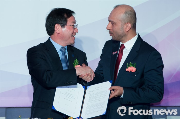 (인천=포커스뉴스) 22일 오후 인천 연수구 쉐라톤인천호텔에서 열린 검단 스마트시티 MOA 체결식에서 유정복(왼쪽) 인천시장과 자버 빈 하페즈 두바이 스마트시티 CEO가 협약서 서명 후 기념촬영을 하고 있다.
