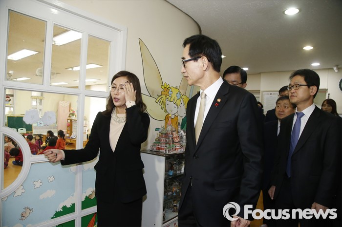 (서울=포커스뉴스) 이준식 사회부총리 겸 교육부장관이 22일 오전 서울 용산구 일민유치원을 찾아 학부모, 보육 관계자 등과 간담회를 열기 전 보육현장을 둘러보고 있다.