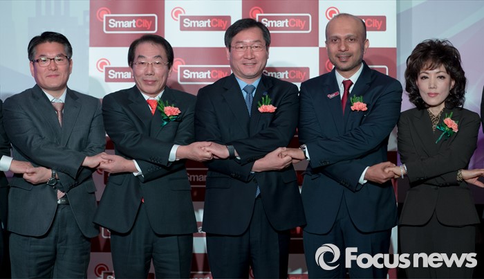 (인천=포커스뉴스) 22일 오후 인천 연수구 쉐라톤인천호텔에서 열린 검단 스마트시티 MOA 체결식에서 유정복(왼쪽 세번째부터) 인천시장과 자버 빈 하페즈 두바이 스마트시티 CEO가 주요내빈들과 기념촬영을 하고 있다.