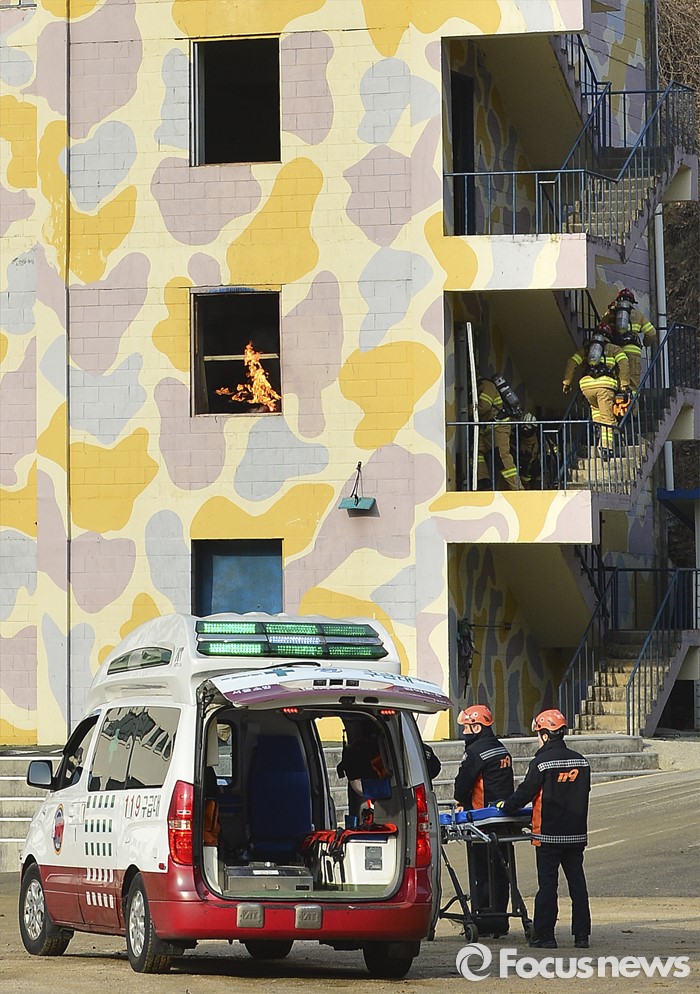 (서울=포커스뉴스) 22일 오후 서울 서초구 서울경찰특공대 훈련장에서 열린 경찰·군·소방 대테러 합동훈련에서 소방대원들이 화재 진압 훈련을 하고 있다.