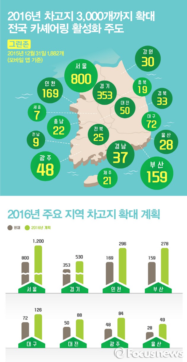 김진홍 그린카 대표이사는 "공유경제의 대표 모델인 카셰어링 그린카가 성장할 수 있도록 응원해주시는 고객들에게 보다 편리한 카셰어링 서비스를 제공하기 위해 그린존을 확대하고 있다"며 "올해에는 차량 서비스 품질을 더욱 강화하고 고객의 니즈에 부합하는 서비스를 제공하겠다"고 말했다.그린카의 차고지 인포그래픽 <사진제공=그린카> 2016.1.22. 김현이 인턴기자