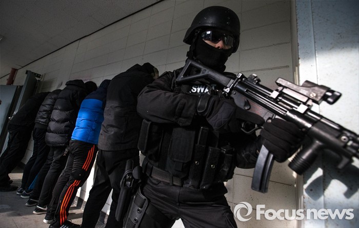 (서울=포커스뉴스) 22일 오후 서울 경찰특공대 훈련장에서 테러상황에 대비한 경찰, 소방, 군 전력이 함께 한 합동훈련이 실시된 가운데 경찰특공대 대원들이 테러범에 의한 인질상항 등을 가정한 훈련을 진행하고 있다.