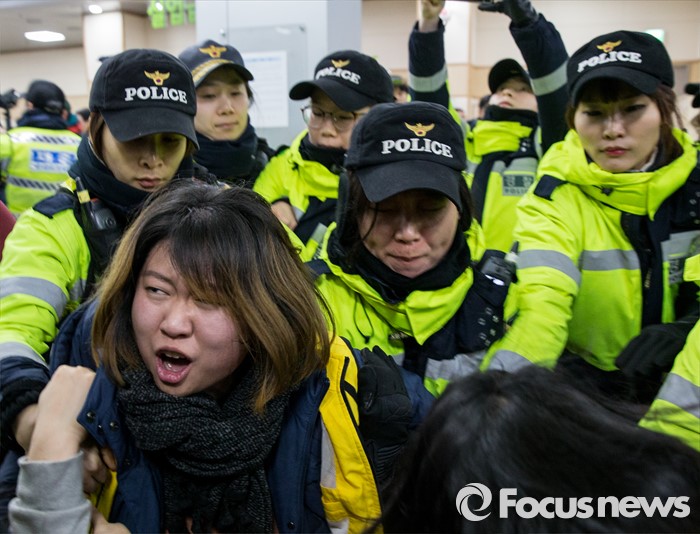 (서울=포커스뉴스) 22일 오후 서울 중구 서울고용노동청을 민원실을 점거한 알바노조원이 경찰에 연행되고 있다. 알바노조 조합원 100여명은 근로감독관 일처리 개선을 촉구하며 노동청을 기습 점거했다.