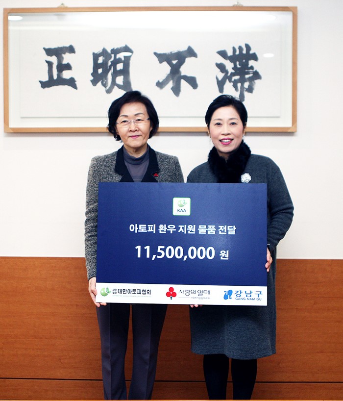 (서울=포커스뉴스) 지난 22일 서울 강남구청에서 열린 '따뜻한 겨울나기 아토피환우 지원 물품 전달식'에서 박경애(오른쪽) 대한아토피협회 회장과 신연희 강남구청장이 기념촬영을 하고 있다.