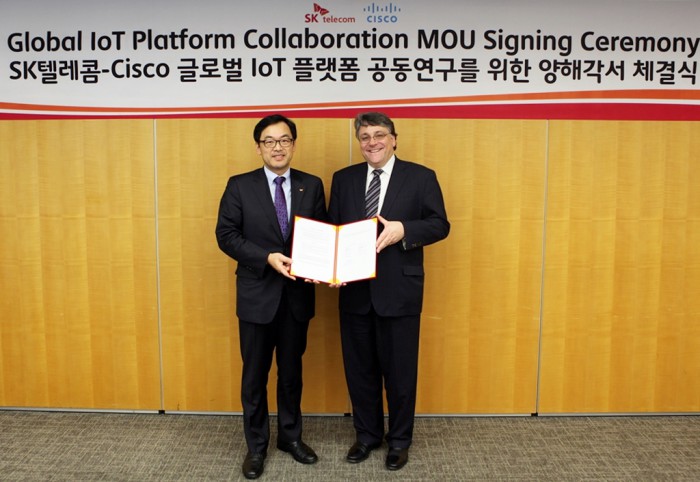 (서울=포커스뉴스) SK텔레콤(대표이사 사장 장동현)은 세계 최대 네트워크 설비 제조·판매 업체인 미국의 시스코와 신규 사물인터넷(IoT·Internet of Things) 솔루션 개발을 위한 업무협약(MoU)을 체결했다고 24일 밝혔다.