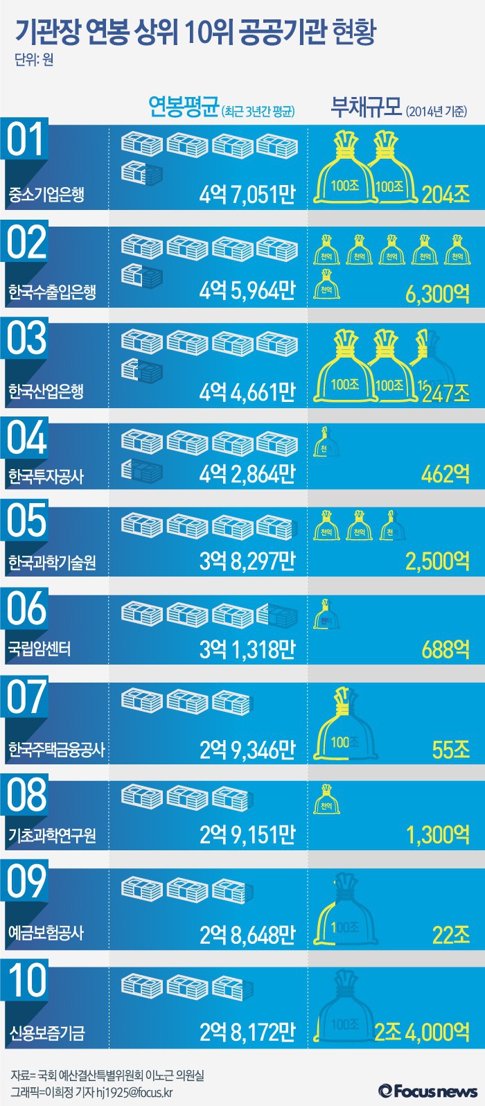 (서울=포커스뉴스) 24일 국회 예산결산특별위원회 이노근 의원이 총 316개 공공기관의 2012~2014년까지 최근 3년간 기관장 평균 연봉을 조사한 결과에 따르면 가장 많은 연봉 받은 기관장은 기업은행장이다.