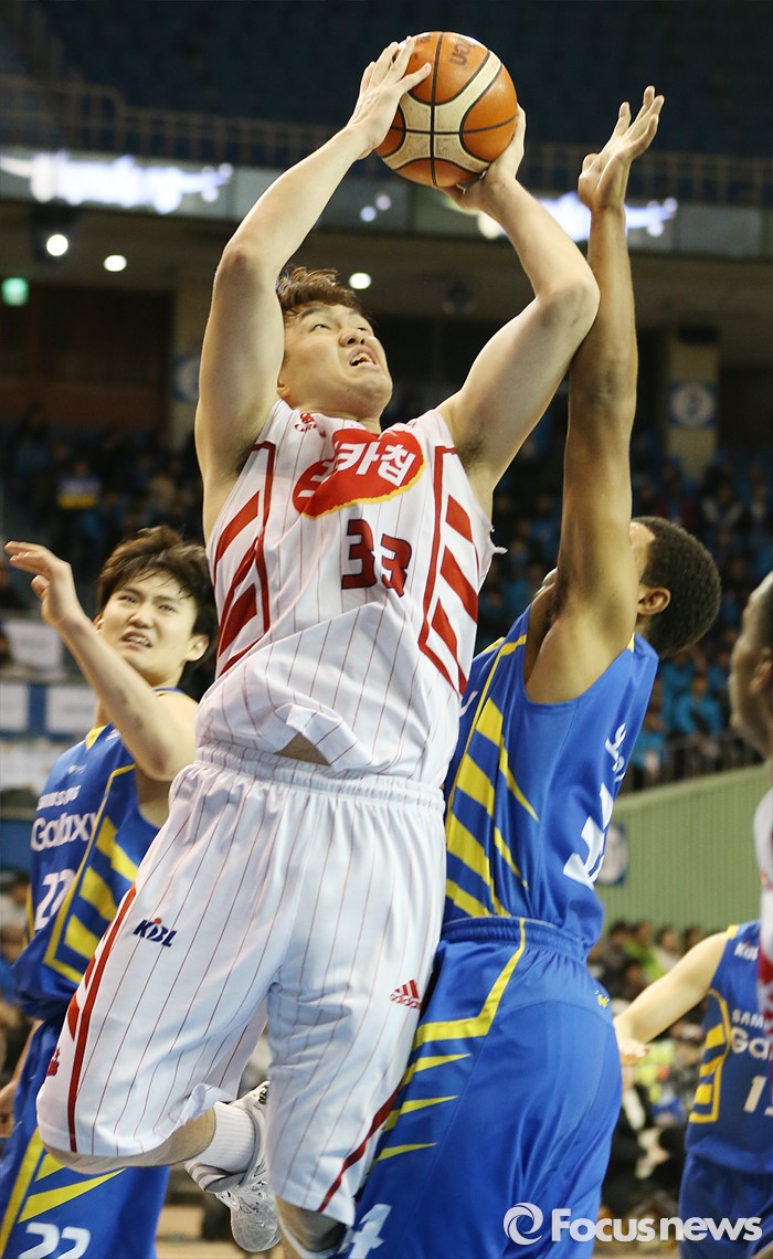 (서울=포커스뉴스) 24일 서울 잠실실내체육관에서 열린 2015-2016 프로농구 삼성-오리온 경기에서 오리온 이승현이 삼선 와이즈의 마크를 피해 점프슛을 시도하고 있다.