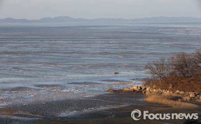 (강화=포커스뉴스) 한파경보가 발효된 24일 인천시 강화군 동검도 앞 바다와 갯벌도 꽁꽁 얼어붙어있다.