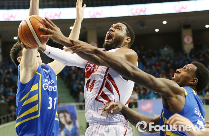 (서울=포커스뉴스) 24일 서울 잠실실내체육관에서 열린 2015-2016 프로농구 삼성-오리온 경기에서 오리온 제스퍼 존슨이 삼성 김준일, 라틀리프의 수비 사이로 레이업슛을 시도하고 있다.
