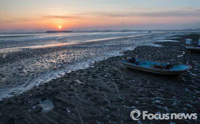 (강화=포커스뉴스) 한파경보가 발효된 24일 인천시 강화군 동검도 앞 바다와 갯벌도 꽁꽁 얼어붙어 어선도 묶여 있다.