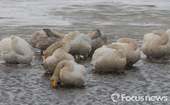(서산=포커스뉴스) 한파특보가 계속되고 있는 25일 오전 충남 서산시 천수만에서 큰고니(천연기념물201호) 들이 얼어붙은 해미천의 눈밭에서 머리를 처박고 추위를 피하고 있다.