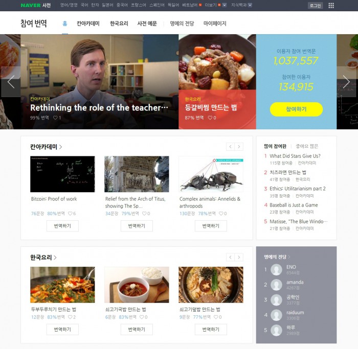 김종환 네이버 사전셀장은 "참여번역 서비스를 통해 이용자들의 자발적 참여로 만들어가는 오픈 플랫폼으로서의 성장 가능성을 확인했다"며 "향후 네이버 글로벌 사전으로의 확장에 있어 좋은 발판이 될 것으로 기대한다"고 말했다.네이버 사전 참여번역 페이지 <사진제공=네이버>