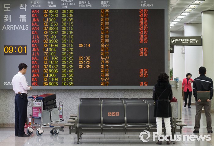 (서울=포커스뉴스) 25일 오전 서울 김포공항 국내선 청사에 제주에서 김포로 오는 항공편의 결항 안내문이 게시되고 있다.