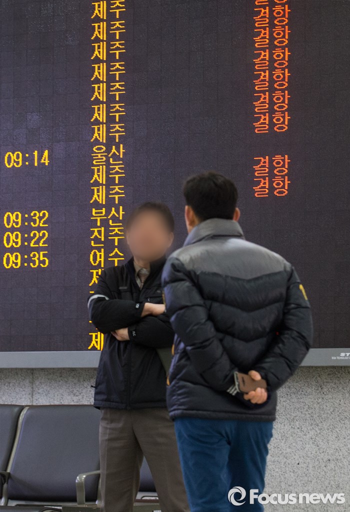 (서울=포커스뉴스) 25일 오전 서울 김포공항 국내선 청사에 제주에서 김포로 오는 항공편의 결항 안내문이 게시되고 있다.