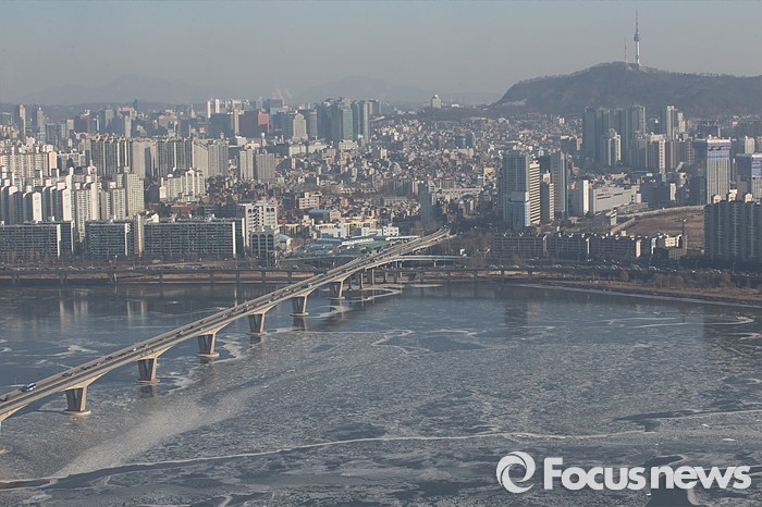 (서울=포커스뉴스) 연일 강추위가 계속되고 있는 25일 오전 서울 영등포구 63빌딩에서 바라본 한강 일대가 얼어붙어 있다.