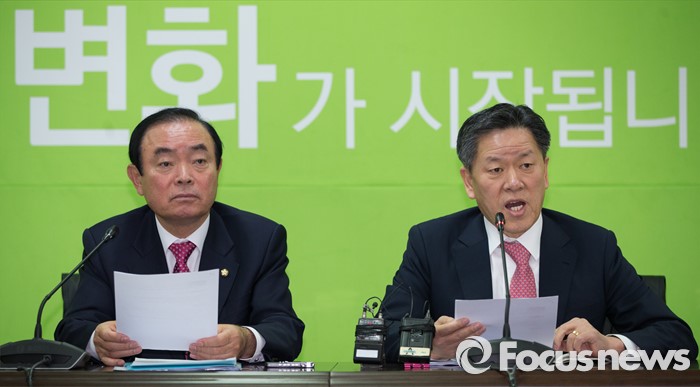(서울=포커스뉴스)장병완 국민의당(가칭) 창당준비위원회 정책위의장과 주승용 원내대표(오른쪽)가 25일 오전 서울 마포구 국민의당 당사에서 전체 기조회의 결과 브리핑을 하고 있다.