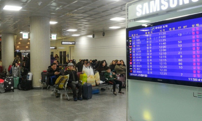 (서울=포커스뉴스) 32년 만에 폭설로 제주국제공항이 폐쇄된지 3일째 되는 25일 오전 제주국제공항 대합실에 모인 관광객들이 운항 재개를 기다리고 있다.
