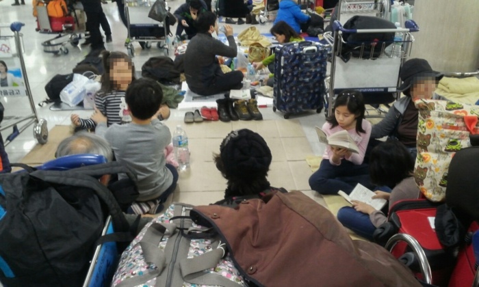 | △ 차가운 공항 대합실에 앉아 있는 관광객들 |