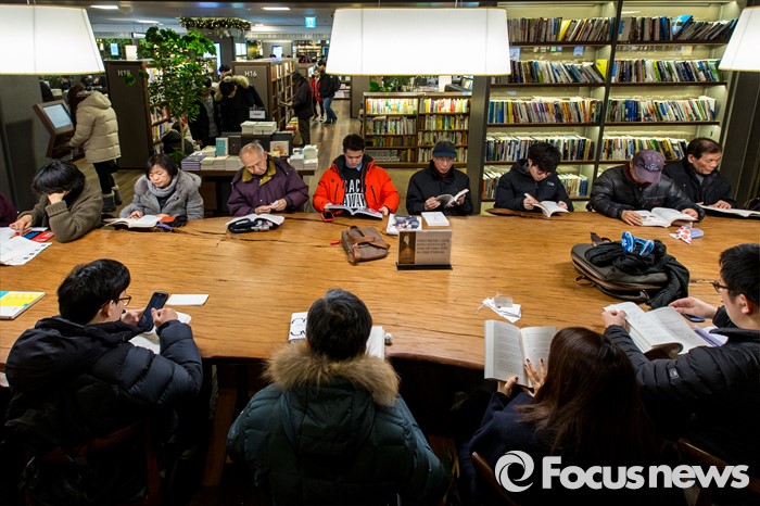 (서울=포커스뉴스) 서울 한 낮 기온이 영하권에 머물며 연일 강추위가 이어지고 있는 25일 오후 서울 종로구 교보문고 광화문점을 찾은 고객들이 추위를 피하며 독서 하고 있다.