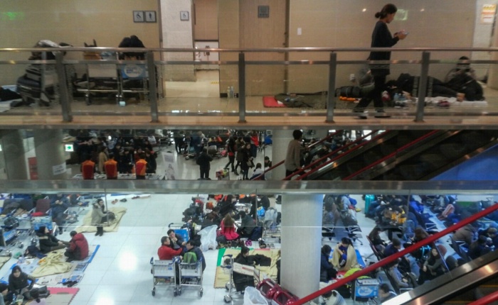 (서울=포커스뉴스) 32년 만에 폭설로 제주국제공항이 폐쇄된지 3일째 되는 25일 오전 제주국제공항 대합실에 모인 관광객들이 운항 재개를 기다리며 바닥에 누워 있다.