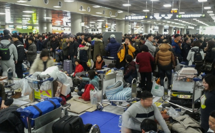 (서울=포커스뉴스) 32년 만에 폭설로 제주국제공항이 폐쇄된지 3일째 되는 25일 오후 제주국제공항 대합실에 모인 관광객들이 항공권을 발권하기 위해 줄을 서 있다. 국토교통부는 25일 오후 12시를 기해 운항을 재개한다고 밝혔다. 하지만 항공기에 쌓인 눈을 제거하는 등 작업들이 남아 있어 실제적인 운항재개는 오후 3시부터 이루어질 전망이다. <사진제공=김세희 사진가>