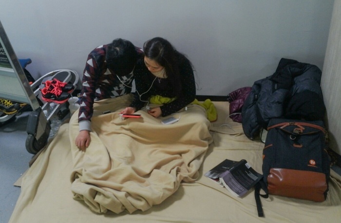 (서울=포커스뉴스) 32년 만에 폭설로 제주국제공항이 폐쇄된지 3일째 되는 25일 오후 제주국제공항 대합실에 모인 관광객들이 항공기 운항 재개를 기다리며 앉아 있다. 국토교통부는 25일 오후 12시를 기해 운항을 재개한다고 밝혔다. 하지만 항공기에 쌓인 눈을 제거하는 등 작업들이 남아 있어 실제적인 운항재개는 오후 3시부터 이루어질 전망이다. <사진제공=김세희 사진가>