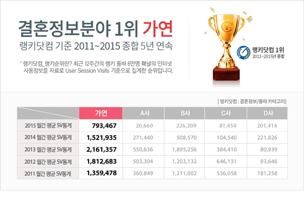 25일 가연결혼정보에 따르면, 지난 한 해 동안 국내 유수의 결혼정보회사 중 SV(시간당 순방문자)에서 압도적인 수치를 기록, 랭키닷컴의 결혼정보·중매분야에서 종합 1위를 기록했다. 이로써 지난 2011년부터 지난해까지 5년 연속으로 종합 1위를 차지했다.