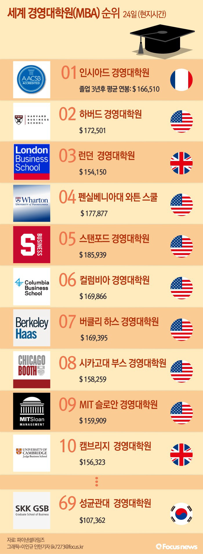 1위를 차지한 곳은 인시아드(INSEAD) 경영대학원이다. 다음으로 미국 하버드대 경영대학원, 영국 런던경영대학원, 미국 펜실베이니아대 워튼경영대학원, 미국 스탠포드 경영대학원 등이 뒤를 이었고, 성균관대학교가 순위에서 69위를 차지했다.