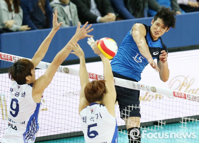 문성민과 외국인선수 오레올이 각각 17득점과 16득점을 올렸다. 문성민은 서브 4득점과 블로킹 2득점 등 전천후 활약을 펼쳤다. 블로킹에서 1득점이 부족해 트리플크라운(서브, 블로킹, 후위 각 3득점 이상) 기록은 세우지 못했다. 박주형(9득점) 송준호, 최민호(이상 6득점) 신영석, 진성태(이상 4득점) 등 고른 득점력을 선보였다.(인천=포커스뉴스) 12일 인천 계양체육관에서 열린 '2015-2016NH농협 V-리그' 남자부 대한항공-현대캐피탈 경기에서 현대캐피탈 문성민이 대한항공 곽승석, 최석기의 블로킹에 강스파이크를 때리고 있다. 2016.01.12 우정식 기자