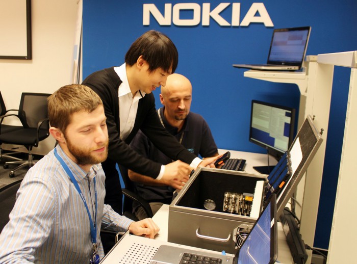김장기 SK텔레콤 국가안전망TF장은 “재난망 본사업의 핵심 솔루션인 그룹통신기술을 통해 재난망 사업의 성공적인 완수에 기여하고 제조사간 호환성을 확보해나가겠다”고 밝혔다.SK텔레콤과 노키아 기술진이 헝가리 부다페스트에 위치한 노키아연구소에서 일괄통신 기능을 시연하고 있다.<사진제공=SK텔레콤>