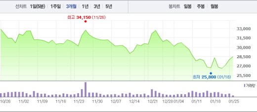 그렇지만 지난해 당기순이익이 4조3240억원(순이익률 23%)을 기록, 3년 연속 사상 최대 연간 경영실적을 달성한 점이 주가에 반영된 것으로 해석된다. 지난해 연간 기준 영업이익은 5조3361억원으로 전년보다 4.4% 증가했다. 지난해 전체 매출액도 18조7980억원으로 2014년보다 9.8% 상승했다.SK하이닉스 주가 흐름<사진출처=네이버 캡쳐>