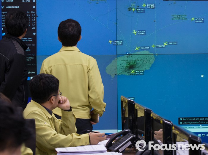(세종=포커스뉴스) 26일 오전 세종시 정부세종청사 국토교통부 제주공항체류여객 비상수송대책본부에서 관계자들이 제주도 인근 운항상황을 점검하고 있다.