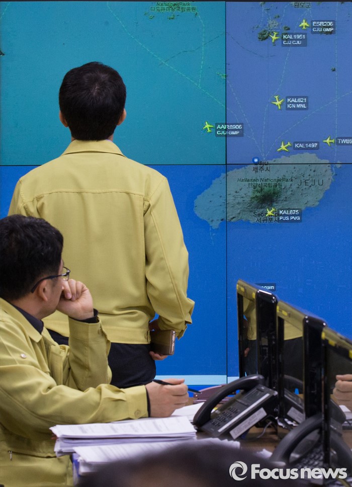 (세종=포커스뉴스) 26일 오전 세종시 정부세종청사 국토교통부 제주공항체류여객 비상수송대책본부에서 관계자들이 제주도 인근 운항상황을 점검하고 있다.