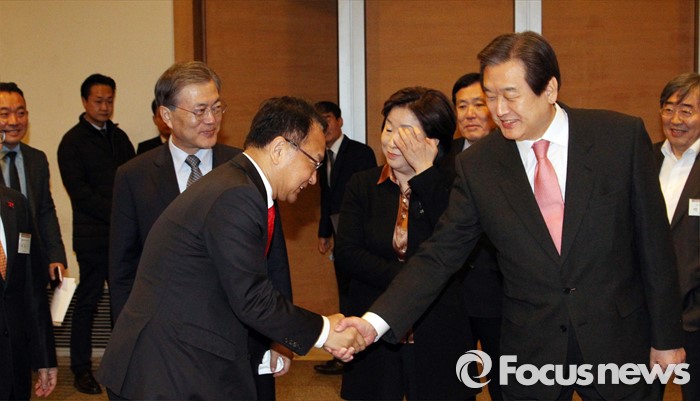 (서울=포커스뉴스) 중장기 어젠다 추진 전략회의가 26일 대한상공회의소 국제회의장에서 열린 가운데 회의전 김무성 새누리당 대표와 유일호 경제부총리 겸 기획재정부 장관이 악수 하고 있다.