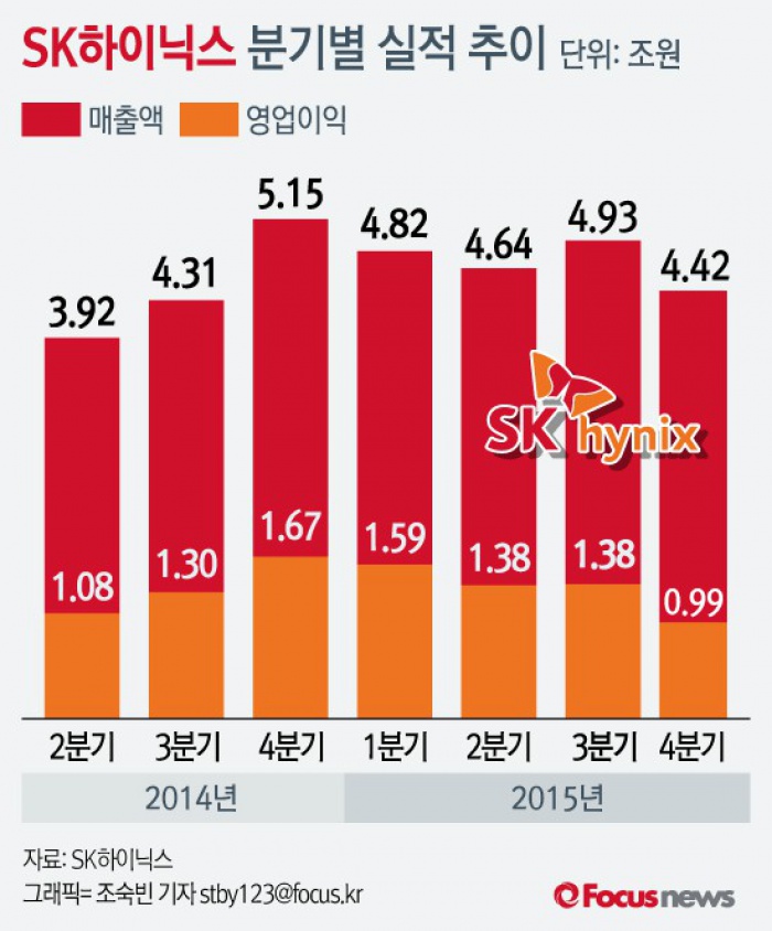 SK하이닉스는 지난해 4분기에 9889억원의 영업이익을 올렸다고 26일 공시했다. 이는 지난해 3분기(1조3832억원)에 비해 28.5% 감소하고 전년 동기인 2014년 4분기(1조6672억원)에 보다 40.7% 감소한 실적이다.