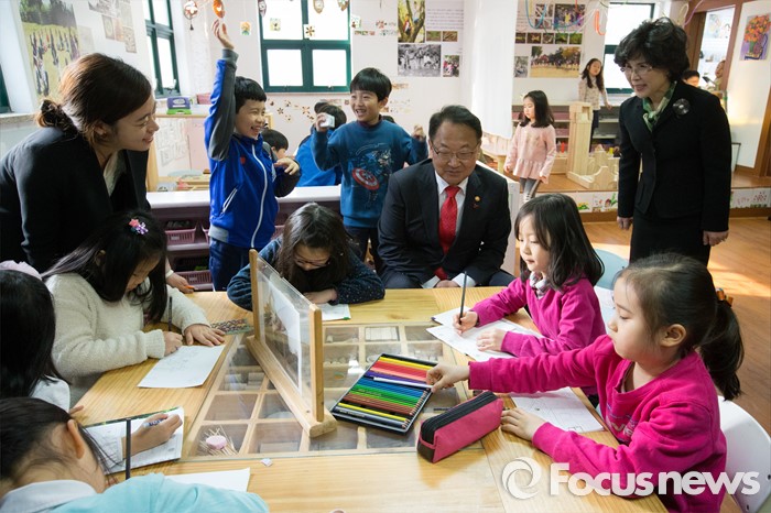 (서울=포커스뉴스) 누리과정 관련 현장을 방문한 유일호 경제부총리 겸 기획재정부 장관이 26일 오전 서울 강서구 보라유치원에 방문해 아이들이 노는 모습을 지켜보고 있다.