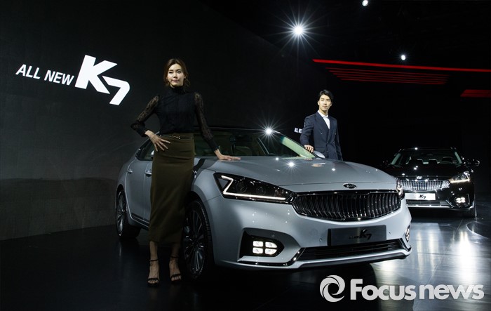 (서울=포커스뉴스) 26일 오전 서울 강남구 그랜드 인터컨티넨탈 서울 파르타스에서 열린 '기아차 올 뉴 K7 신차발표회'에서 모델들이 포즈를 취하고 있다.
