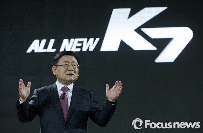 (서울=포커스뉴스) 26일 오전 서울 강남구 그랜드 인터컨티넨탈 서울 파르타스에서 열린 '기아차 올 뉴 K7 신차발표회'에서 이형근 기아자동차 부회장이 신차 발표를 하고 있다.