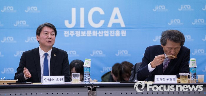 (전주=포커스뉴스) 국민의당 안철수 의원과 한상진 공동 창준위원장이 26일 오후 전주시 완산구 전주정보문화산업진흥원 IT벤처센터에서 벤처기업 종사자들과 함께하는 도시락 간담회를 갖고 있다.