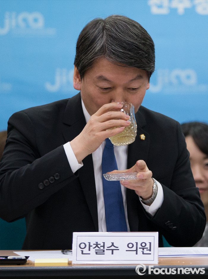 (전주=포커스뉴스) 국민의당 안철수 의원이 26일 오후 전주시 완산구 전주정보문화산업진흥원 IT벤처센터에서 열린 벤처기업 종사자들과 함께하는 도시락 간담회에서 물을 마시고 있다.