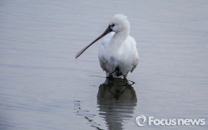 (서산=포커스뉴스) 26일 초천수만에서 월동중이던 겨울철새 노랑부리저어새(천연기념물 205호) 의 가슴에 철사줄이 엉켜있어 구조의 손길을 기다리고 있다. 서산 김신환동물병원장이 처음 발견한 이 노랑부리저어새는 이틀째 이런 상태로 혹시라도 이 철사줄이 더 좋이게 되면 생명이 위태한 지경이다. <사진제공=김신환원장>