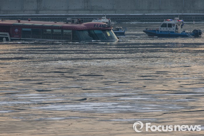(서울=포커스뉴스) 26일 오후 서울 한강 영동대교 인근을 지나던 한강유람선이 침수, 구조대원들이 구조활동과 견인 작업을 하고 있다.