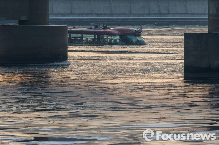 (서울=포커스뉴스) 26일 오후 서울 한강 영동대교 인근을 지나던 한강유람선이 침수, 구조대원들이 구조활동과 견인 작업을 하고 있다.