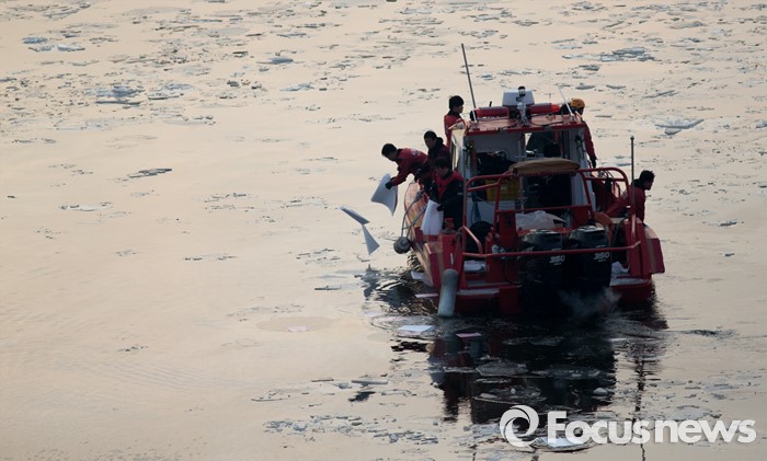 (서울=포커스뉴스) 26일 오후 서울 한강 영동대교 아래에서 침수된 한강유람선에서 기름이 유출되자 소방대원들이 던지고 있다.