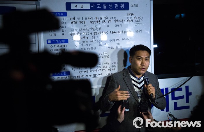 (서울=포커스뉴스) 26일 오후 서울 한강 영동대교 아래에서 한강유람선이 침수된 가운데 이랜드 관계자가 취재진 앞에서 브리핑을 하고 있다.