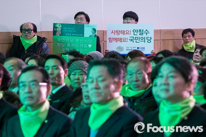 (부산=포커스뉴스)국민의당 안철수 의원과 한상진 공동 창준위원장이 26일 오후 부산 해운대구 벡스코에서 열린 국민의당 부산시당 창당대회에 참석하고 있는 가운데 당원들이 안철수를 지지하는 피켓을 들고 서 있다.